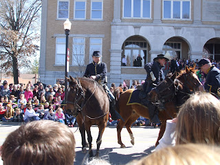 The City of Bentonville commemmorated the 150th Anniversary of the Battle of Pea Ridge with a reenactment in downtown Bentonville on Friday, March 9, 2012. Everyone was invited, and since the school where I am currently substituting is two blocks from downtown, then we were all going! Yes! The entire school was dismissed to walk downtown to view the reenactment. Fortunately the weather was perfect and also, security is not an issue here. We simply walked out of the building with our class, and 5th grade classes followed 6th grade classes. No streets were closed and traffic was not stopped. No added security was necessary. Just teachers, parents that wanted to attend, and students, walked from D Street up 2nd Street to Main Street and then we stood near the podium in the town square to observe the battle. It was fun, and I'm so glad that I got to experience this with the 5th graders in Bentonville!! The boys especially loved it, the girls squealled and covered their ears when the guns and cannons roared!